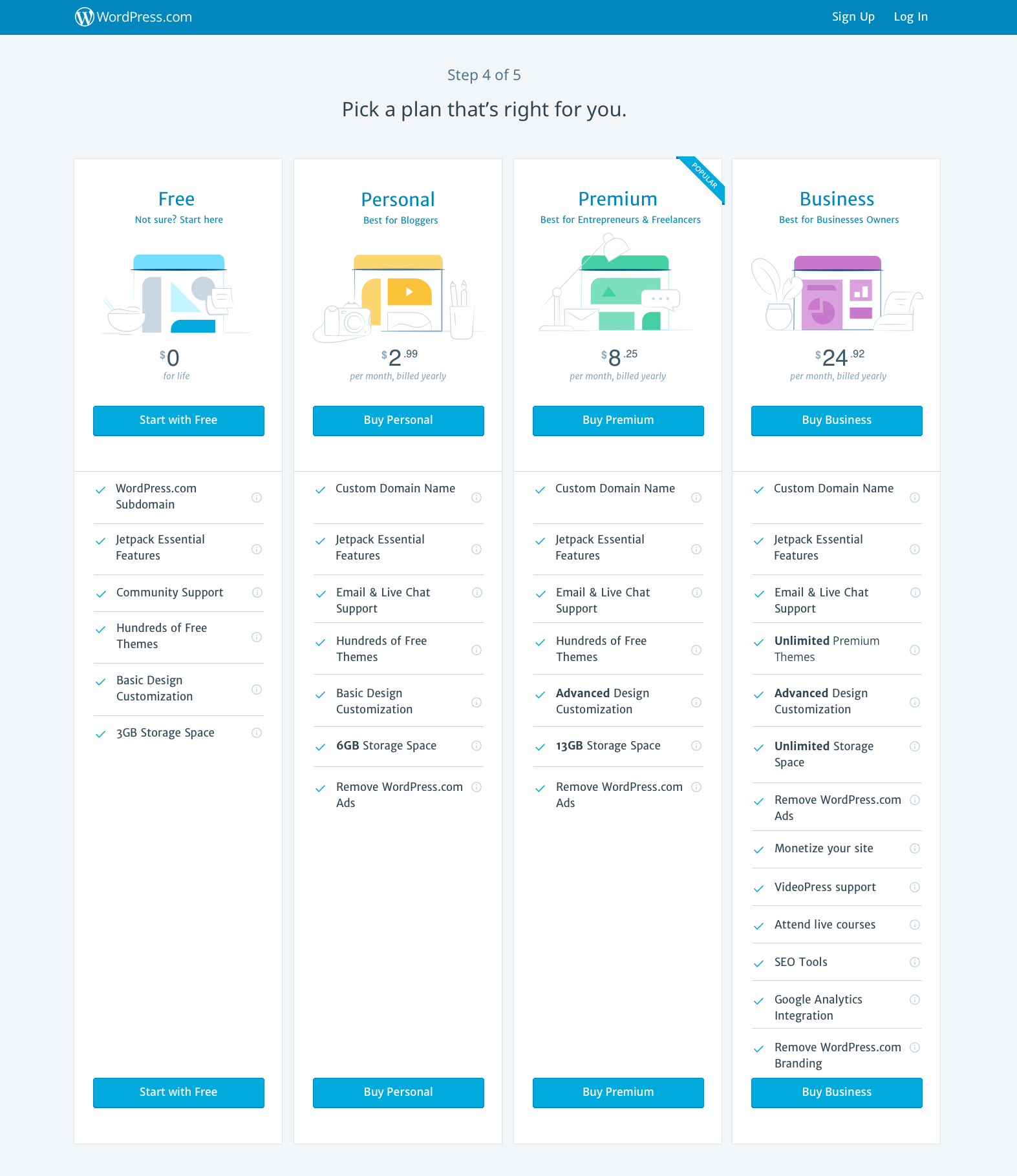 WordPress.com pricing table with illustrations. Designed by Cristel