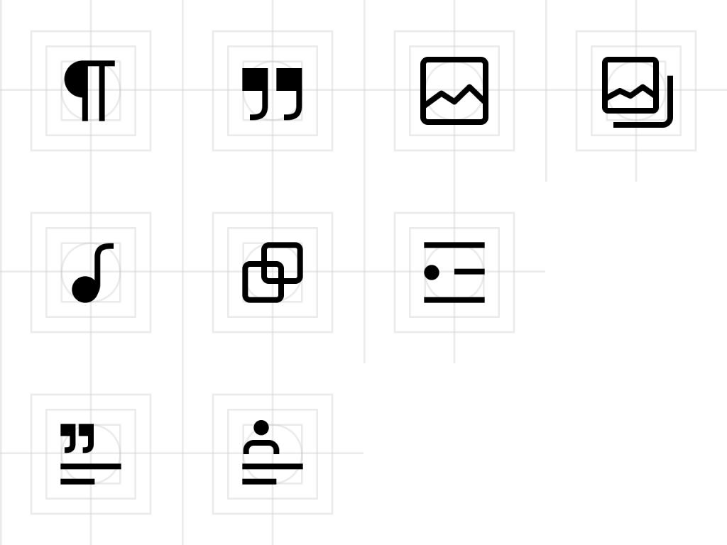 Choosing a distinct icon to use for a block should be easy for a developer, to avoid the same icon being used to represent two different blocks. To enable this clear ease of use, a set of design principles was adopted that made the new icon set both visually simple and stylistically compatible with a range of freely available icon libraries. A baseline grid of 24×24 furthered that compatibility, as those same dimensions are used by big open sets such as Material, Streamline, and Zwicon.