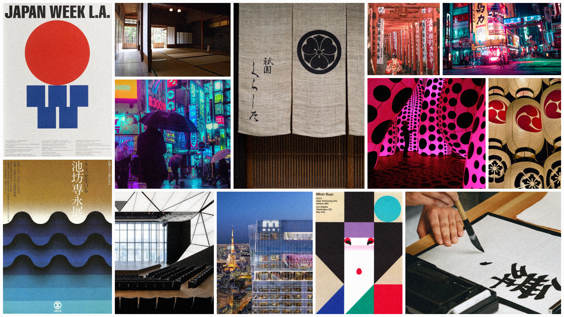 As we embarked on the journey of designing State of the Word in Tokyo, we began by connecting with our friends in the local community. Our research took us on a fascinating journey through Japan’s rich cultural heritage, from its traditional architecture and textile art to the bold influences of modern pop culture. We explored the works of graphic design legends like Ikko Tanaka and Yusaku Kamekura, the fluidity of kanji art, and the striking neon aesthetic that defines Tokyo.